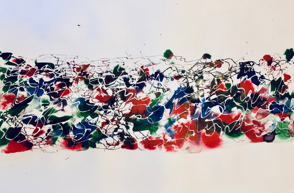 This A1 size piece was created in response to the day to day journeys we make. Inspired by the lines created by a mapping app, but also the blurred colours and patterns seen as you speed past hedgerows in a car. It is created using ink on paper.